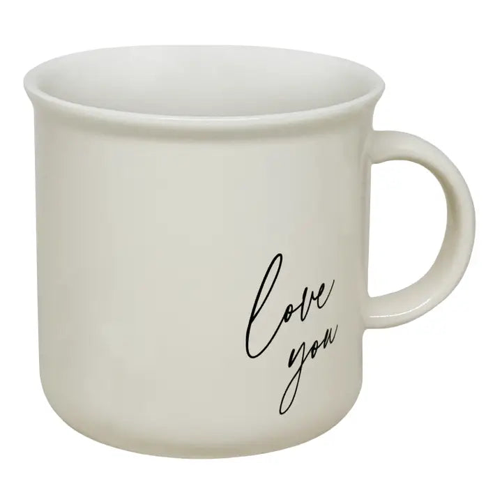• 11oz Capacity • Campfire Style Mug • Cream neutral color with black script "Love You" design on both sides • Size: 3.75"W x 3.63"H (4.88" w/handle)